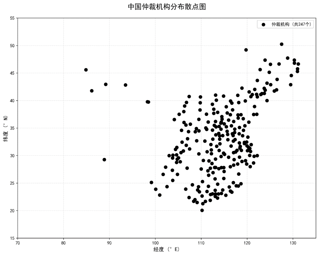 近5年来,全国中等城市仲裁机构数量呈现出较为明显的增长态势。从地域来看,中等城市仲裁机构的分布呈现出一定的不均衡性,为客观呈现这一格局,图1展示了全国247个中等城市仲裁机构的分布情况(非仅限于样本城市)。