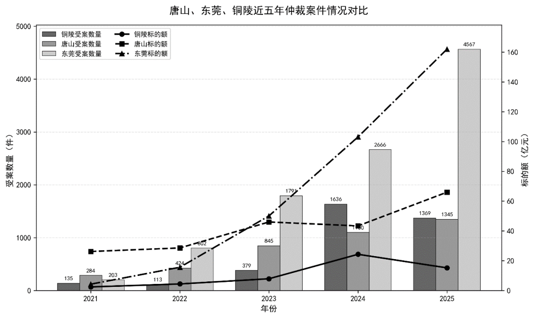 图2 2021-2025年铜陵、唐山、东莞仲裁委员会(注:图2图例中的“铜陵”、“唐山”、“东莞”分别指铜陵仲裁委员会、唐山仲裁委员会和东莞仲裁委员会。)受案数量和标的额